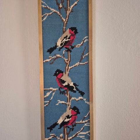 Vakkert håndbrodert bilde av dompapper med fin ramme 18cm x12cm. kr 125