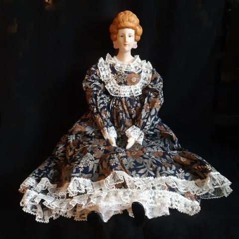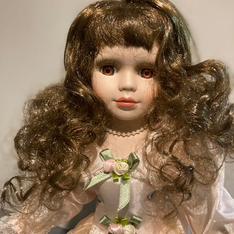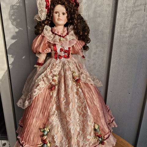 Nydelig dukke i porselen med stativ slik at den står til pynt i rommet. Har ligget lenge på loftet ubrukt og trenger kanskje litt strykjern for å se enda finere ut