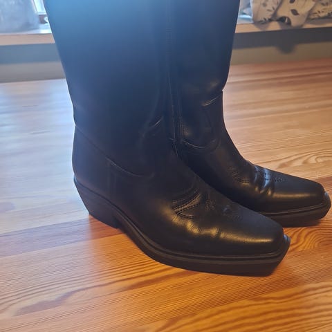 Moteriktige cowboystøvler i ekte skinn, høye hæler, svarte. Størrelse 36.
