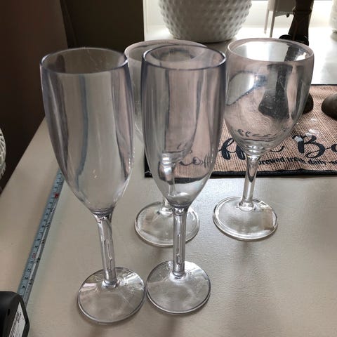 Plastglass 12 stk. 4 blanke rødvin, 4 hvitvin (1gul og 3 blanke) og 4 blanke likør. Ingen skader men hvitvin og likørglass har riper. Ellers ingen skader. Selges samlet. Sendes mot porto.
