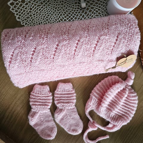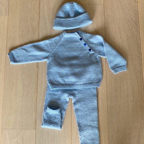 Bluum babysett perlestriper i 1-2 år. Strikket i dus rosa soft merino. Kr 1650