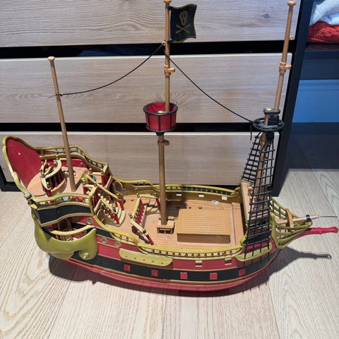 Jeg selger masse Kapteinsabeltann leker, jeg selger den sorte dame, figurer som er følgene pelle og pysa, langemann, Kapteinsabeltann, Skalken, Benjamin og Oliver. I pakken er det også en stor kiste med diamanter og det er med kanoner med skudd, det er også med gullpenger i en pose