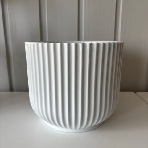 Vita utepotte med fat selges. Denne potten finnes i 3 størrelser, og dette er den største, høyde 44 og diameter 39. Veldig fin potte, men ble litt for stor hos meg.