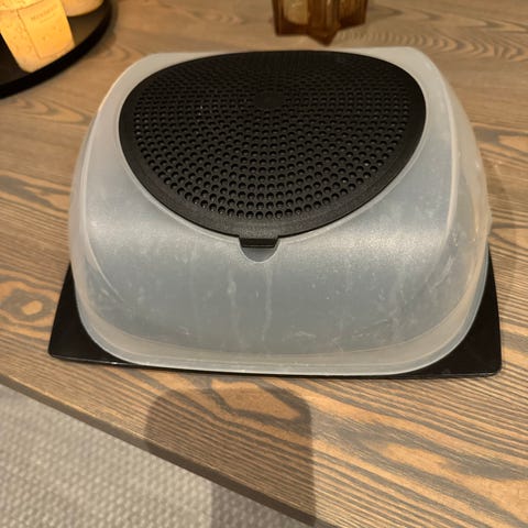 Stor Tupperware oppbevare og servere osten i samme beholder.Osteklokken har Condens Controlfilter i lokket, holder lukten inne og fukten under kontroll. Ta ut filteret av lokket og vask det for hånd. Bunn og lokk kan vaskes i oppvaskmaskinen. Lokket bør åpnes og lykkes jevnlig.