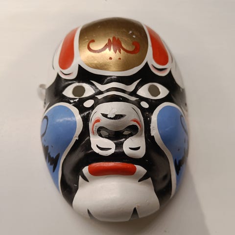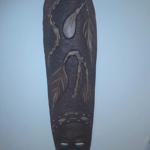 Maske i tre laget av ekte asiatisk håndtverk. Spreke farger og et skikkelig grin, perfekt om du ønsker et noe annerledes preg på hjemmet enn hva alle andre har. Den ble kjøpt i Hong Kong og har hengt uforstyrret på en vegg i mange år, og trenger nok en vask.