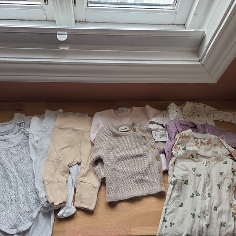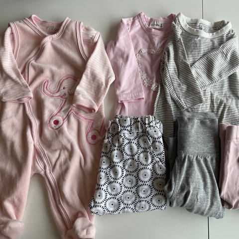 Klespakke med 2 sett til jente i str 50/56. Klærne er pent brukt og i god stand. Fra røyk og dyrefritt hjem. Brukt i noen få uker.