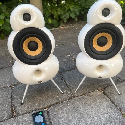 Kjøpt på HIFI-klubben. Stilige høyttalere som passer like godt på kontorpulten eller som tilkoblet til et tv. Fantasien setter grenser med bluetooth. Kan kobles med 3,5mm kabel også for analogt signal.