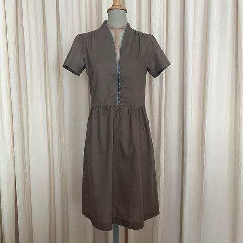 Kjole i 30-talls fasong med kinesiske knuteknapper. Skjult glidelås i siden. I lett semi transparent bomull. Kjolen er i mocca m lyseblå detaljer. Søt og delikat kjole til hverdags og fest.
