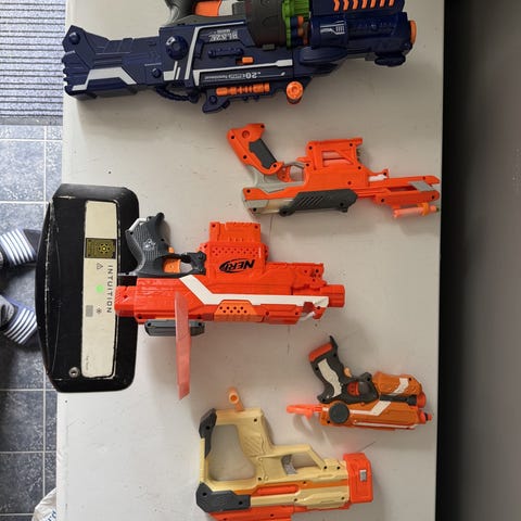 Disse er omtrent ikke brukt, en av de brukt en gang. De andre muligens 2 til 3 ganger. Boks full med nerf skudd følger med.