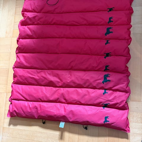 Fleece øverst, kraftig nylon under og på kantene. Glidelås for vask av trekket.