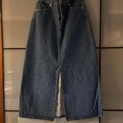 Kult skjørt fra Monki i denim selges. Skjørtet har en høy splitt både foran og bak.