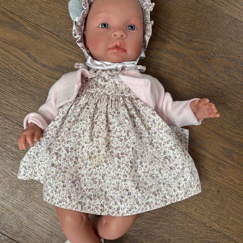 Maria wears a cute dress with small flowers. She comes with pacifier. Head and body is made entirely from vinyl. 43 cm.