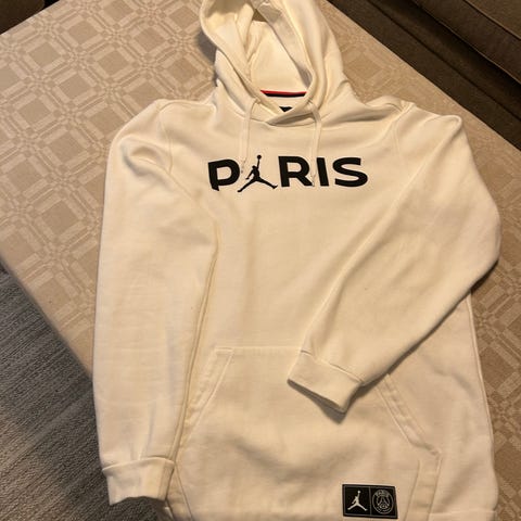 Selger en stilig Jordan x Paris Saint-Germain genser i størrelse M. Genseren har klassisk hvit og svart fargekombinasjon, PSG-logo på brystet og Jordan-logo brodert på motsatt side. Den er laget i et komfortabelt, strikket stoff og har glidelås hele veien foran samt sidelommer med glidelås. Nypris var rundt 2500kr