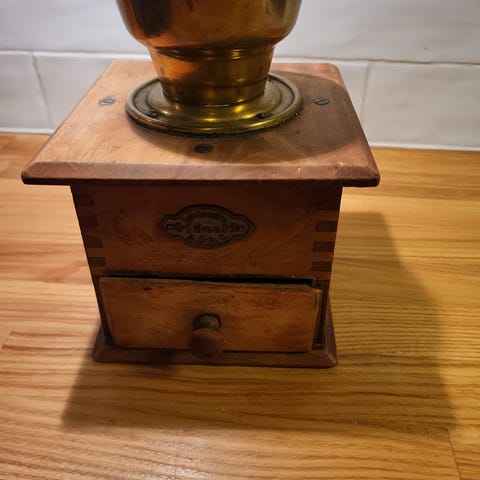 Fin gammel kaffekvern. Står GARANTIERTE WARE-ZASSENHAUS-GESCHMIEDETES MAHLWERK. GI BUD. PORTO 69.