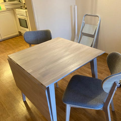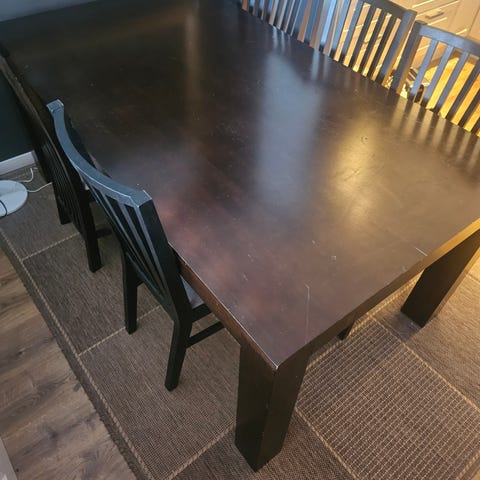 Pent brukt. Seks tilhørende stoler. 120cm lang, 160 med klaff.