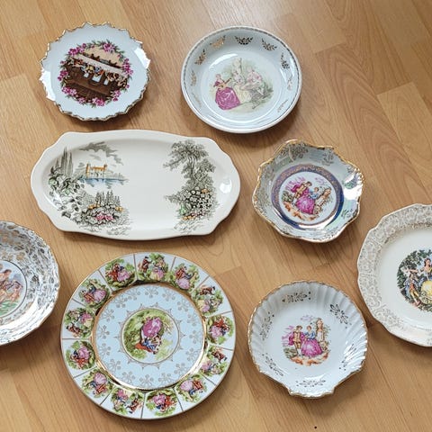 1 fat med perforeringer i porselenet og noe slitt dekorering. Uten stempel/produsent.