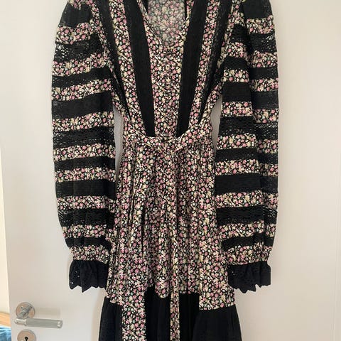 Ubetydelig brukt kjole, hel og pen. Fin til selskap. Avtagbart belte i livet. Strikk i livet. Viscose, går til midt på leggen på meg, jeg er 170cm.