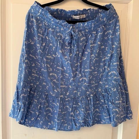 Pent brukt. Sort med blomstermønster. Str 44, mer som L, kan også passe XL. Snøring og strikk rundt livet. Noe volang i nedre del på skjørtet.