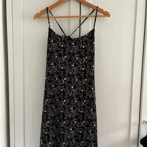 Nydelig lang kjole sort og sølv med stropper i glinsende fint stoff str S, ubrukt. Blomstrende mønster i sort. Med sorte stropper.perfet til fest jul julebord og annen feiring