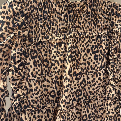 Pen bluse i leopardmønster, romslig i størrelsen, liten rysjekant i halsen og svake gulltråder i stoffet, selges kr 360. I
