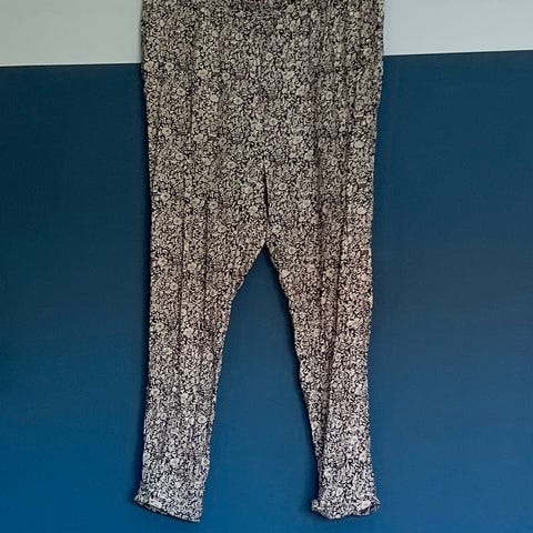Tynn og luftig sommerbukse fra Indiska, litt vid i beina, med svart og hvitt mønster. Str M, men passer også L. strikk i livet.