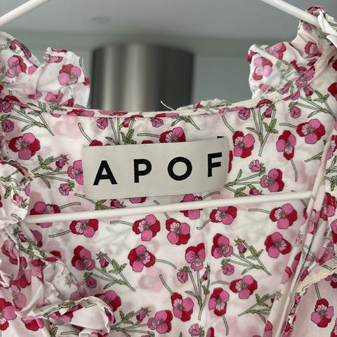 APOF topp i seersucker / bomull. Veldig fint snitt med høy hals og 3/4 lange ermer med fine mansjetter. Lukkes med knapp i nakken. Mønsteret er i gult og blått. Dessverre en størrelse for stor for meg. I god stand og ingen anmerkninger.