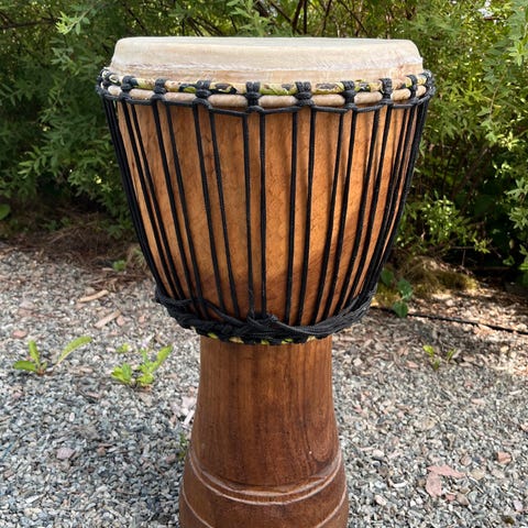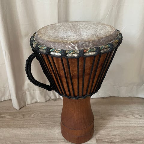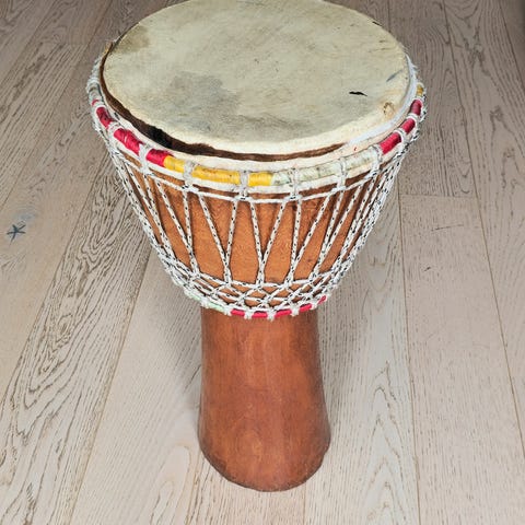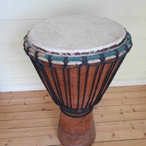 Med ekte geiteskinn, og fine utskjæringer. Det dreier seg om 100% håndlagde instrumenter, som er bygd i overenstemmelse med afrikanske håndverkstradisjoner. Ny pris var over 3000 kr.