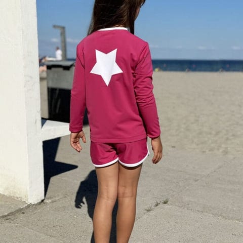 Kortermet sol- og badegenser som beskytter huden så den ikke blir solbrent.