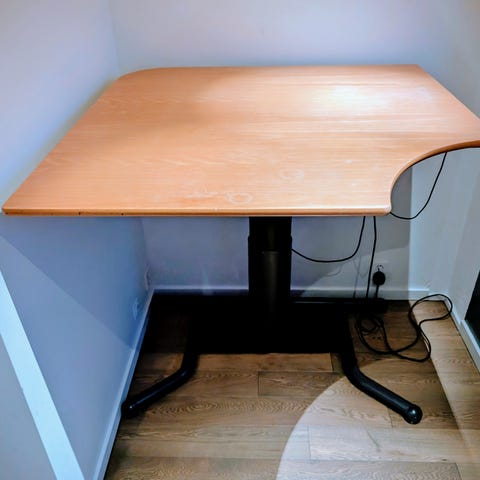 Fin elektrisk justert skrivebord. Blir for trangt i barnerommet. Størrelse 160x80cm kan justeres til ståhøyde for voksne. Veldig praktisk. Men ikke for en liten unge som skal kun gjøre lekser. Plass til to monitorer og en lang skjerm osv. mye spennende oppsett man kan gjøre med den