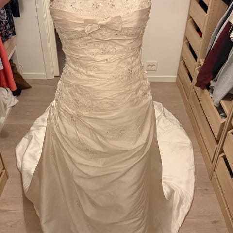 Selger en kjempefin brudekjole fra Pronovias. Den har et lite ekstra som gjør det enklere å gå med. Slepe kan henges på en lite hake i ryggen og så er hele kjolen i samme lengden og du kan danse og enkelt gå med. Du kan ha kjolen med eller uten underskjørt.