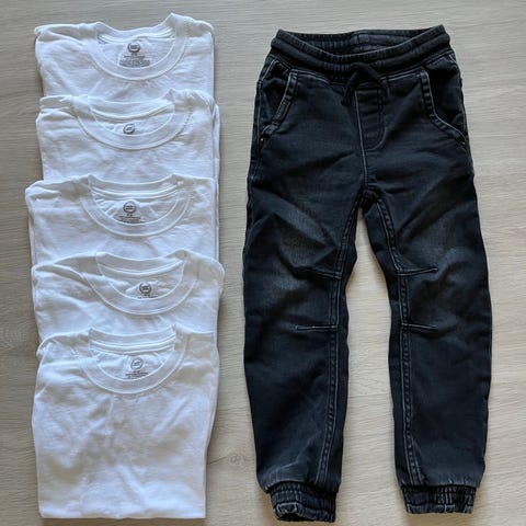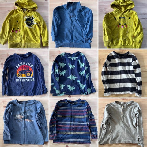 Klærne er 98/104 og 104/110, men de er brukt samtidig. Folk og røvere t-skjorta er str 2 år, men er lik i str som 98/104.