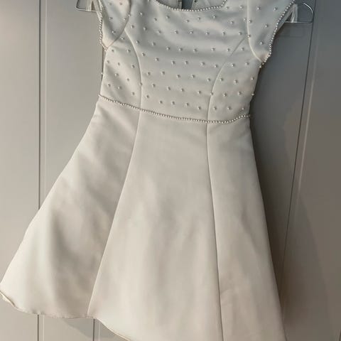 Helt fantastisk nydelig brudepike kjole. Vill tippe kjolen er str 92. Står ikke noe spesielt inni, jenta vår har gått over i 92 i klær nå og brukte denne i 2 timer i helga. Kan nok passe ei som nærmer seg 98 også.