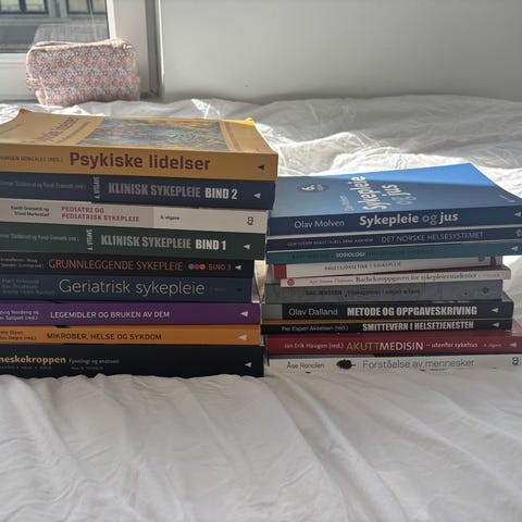 Selger pensumbøker til alle 3 årene på sykepleier studiet, noen av dem er kjøpt brukt og andre er kjøpt helt nye. Alle er pent brukt, men noen har litt bruksmerker pga de er kjøpt brukt.