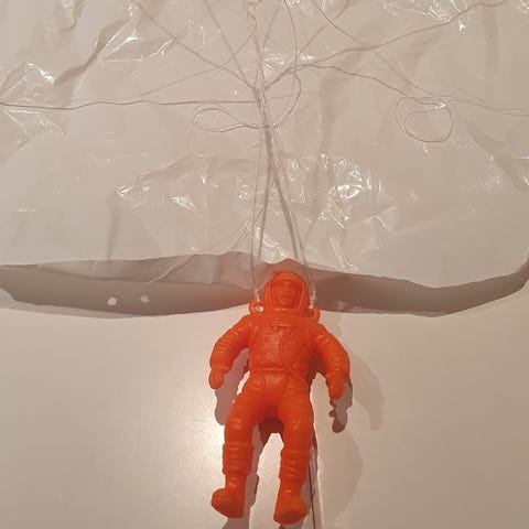 Leke med figur som hopper fallskjerm. Kan kastes upp i luften eller släppas från en höjd.