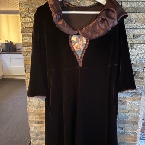 Fløyelskjole i avlslappet fasong. Fargen er en nydelig varmrød tone, som heller mer mot gyllent en rosa. Materialer er kjempedeilig og består av viskose og silke, ikke polyester slik mange fløyelstekstiler gjør.