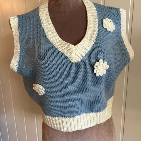 Strikket vest med en cropped silhuett, v-hals og heklede patchworkdetaljer. Kan brukes alene, men er også veldig fin med t-skjorte eller skjorte under. Materiale: 100% bomull.