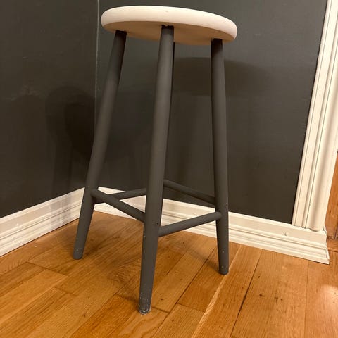 Brukt, men fortsatt god. Man kan justere sete og rygg individuelt frem og tilbake og opp og ned og hele stolen kan heises opp og ned. Den vipper litt forover men vi får den ikke til å vippe bakover derfor selges den veldig billig.