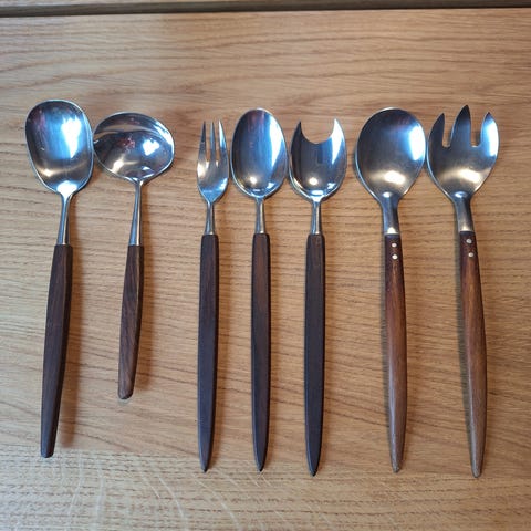2 Skaugum gafler (21 cm.) kr. 150,-/stk. 1 Skaugum skje syltetøyskje (13 cm.) kr. 150,-. 1 Skaugum pai spade (21 cm.) kr. 150,-. 1 salt & peppersett med gullfarget topp kr. 250,-. 4 store gafler (22 cm.) (Merket Rustfrei Germany) kr. 50,-/stk. Salatbestikket, potetskjeen, teskje og skje m/sort skaft og er solgt! Jeg pakker trygt og sender gjerne for kr. 70,- inkl. sporing og forsikring