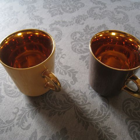 To nydelige «gull» mokkakopper med tefat / skål under.
