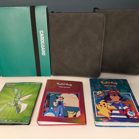 Disse er nesten helt ubrukte. Charizard Binder har hatt kort i sig 1 gang. Samme gjelder mesteparten av side-loading pockets å. Alle lommer og i alle albumene som har lommer i seg settes kortene inn fra siden. D-rings albumene er helt ubrukte. Kun åpnet.