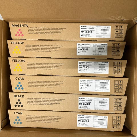 Ricoh MP C2551 tonerpatron sett i fargene cyan, magenta, gul og svart. Tonerpatronene er beregnet for bruk i Ricoh MP C2551 multifunksjonsskrivere. Hver patron leveres i original emballasje med tydelig merking av farge og modell. Egnet som erstatningstoner for kompatible Ricoh kontorskrivere som bruker MP C2551-serien.