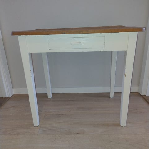 Bordet er litt for lavt til å fungere som skrivebord til en voksen, men kan fungere til barn eller som et sminke/pyntebord. Mormoren min hadde et speil stående på bordet og smykker og slikt stående der, så hun satt der og ordnet seg.