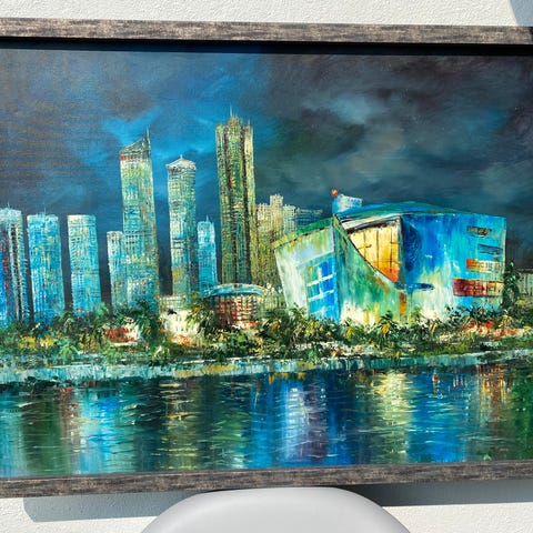Maleri på lerret, signert, str 50x60 cm, kan hentes på Halvorsen Konditori i Oslo sentrum.