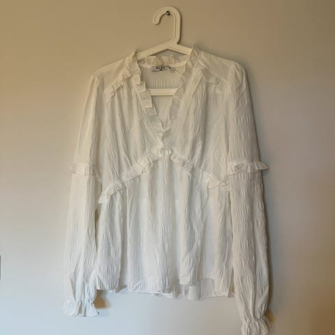 ASOS Stradivarius hvit langermet cropped ruffle bluse i størrelse M.
