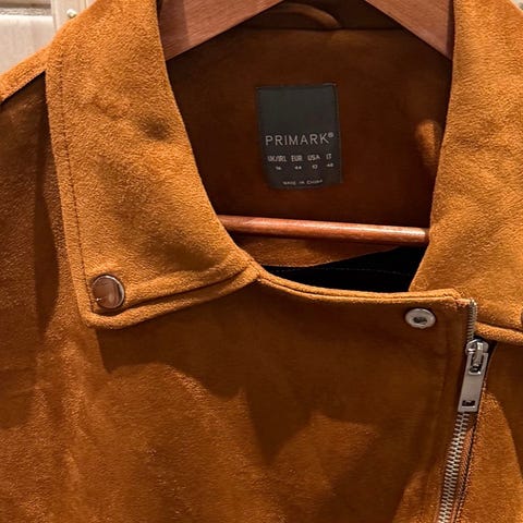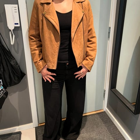 Brun, semsket skinnjakke.