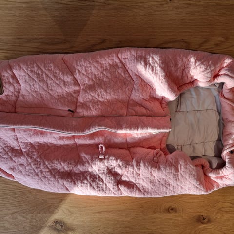 Glidelås midt på, som gjør at vognposen kan brukes som leketeppe