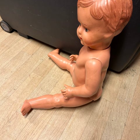 Gammel gummi dukke, aldri vært ute av esken.
