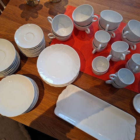 Veldig koselig og nett servise til åtte. Med fløtemugge og sukkerskål med lokk.