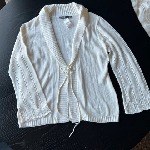 Hvit strikkejakke i akryl med fint halsparti .Fin også utenpå en lettere kjole.