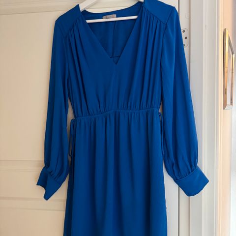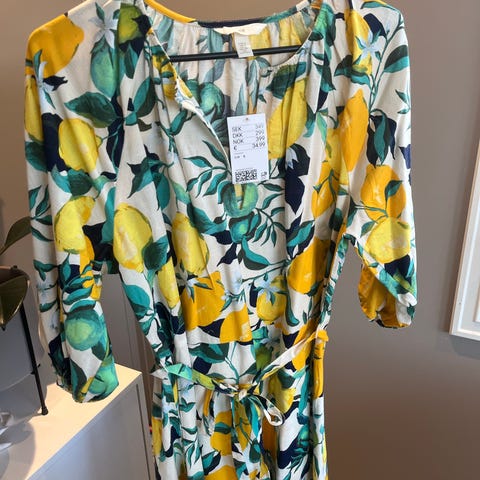 Sommerkjole fra Hennes & Mauritz. Kort kjole i teksturert jersey med hjerteformet halsutringning og smale halterneckstropper som knytes i halsen. Formstøpte skåler og åpning foran. Trukket elastisk linning og utsvinget skjørt. Veldig søt kjole!